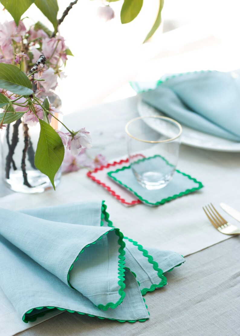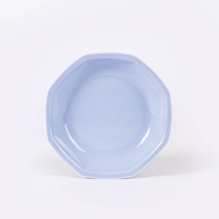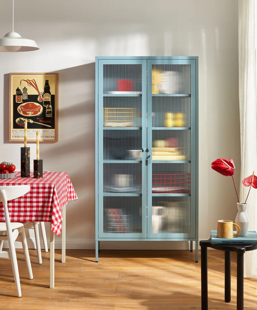 Serviette de table en lin bleu poudré – March6TEEN // Tabouret bleu pâle – TipToe // Assiette creuse bleue en porcelaine – Ogre la Fabrique // Armoire vitrée bleu océan – Mustard // Tasse Cappuccino bleu – Neroli Studio // Nappe AMELIA BLUE FLOWERS STRIPES – Lemonade Home //