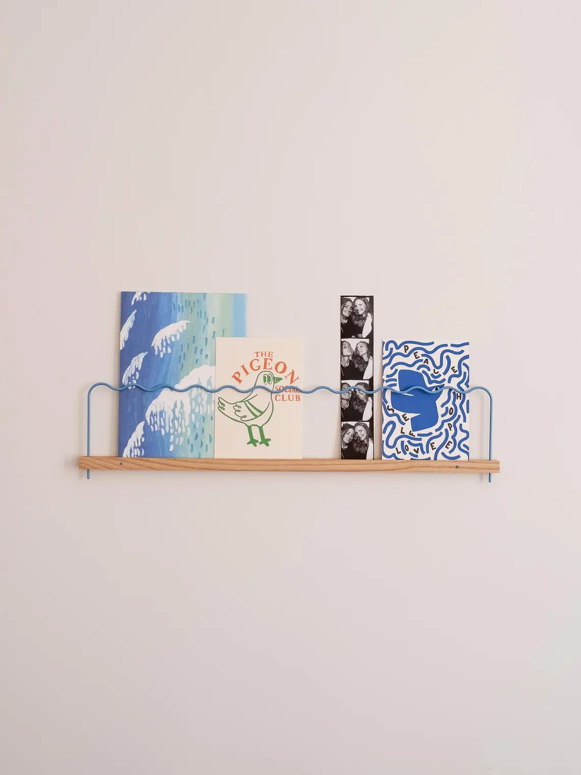 Peinture bleu On mute – Blime // Abat-jour coupole azur – La case de cousin Paul // Papier peint VINTAGE BLUE – Maison Janette // Étagère à photos bleu pastel – Gllu // Lampe Iva bleu pastel– Silly et Billy // Linge de lit bleu ciel – la cerise sur le gateau //