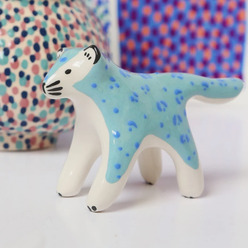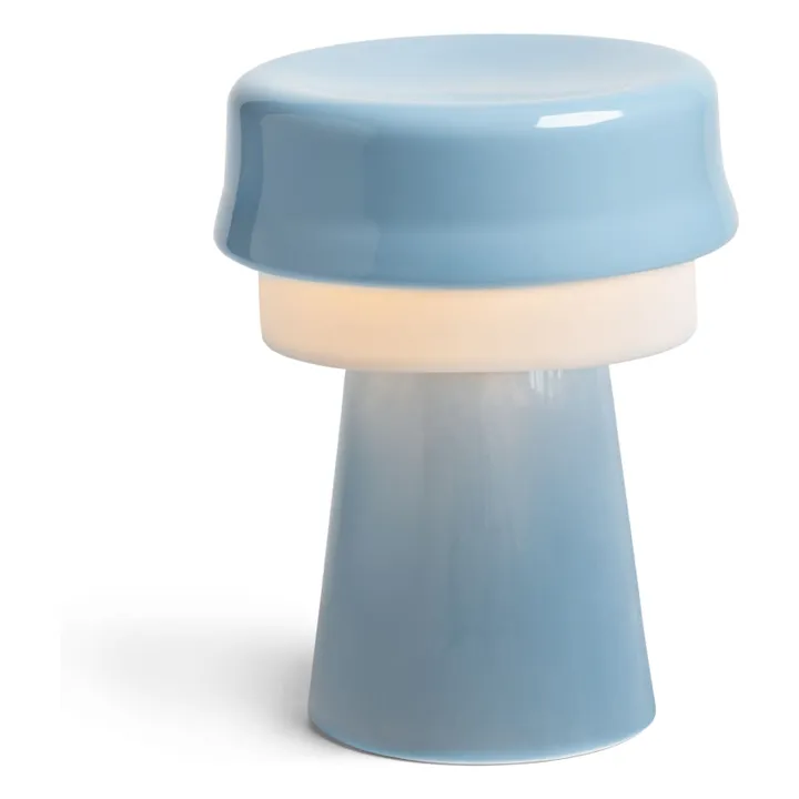 Etagère acier bleu pastelv – TipToe // Lampe en porcelaine Bleu – &Klevering // Figurine Léopard bleu – DodoToucan // Pouf bleu clair – Nobodinoz // Tapis nuage bleu – Lorena Canals // Grand coussin rayé bleu – FermLiving //