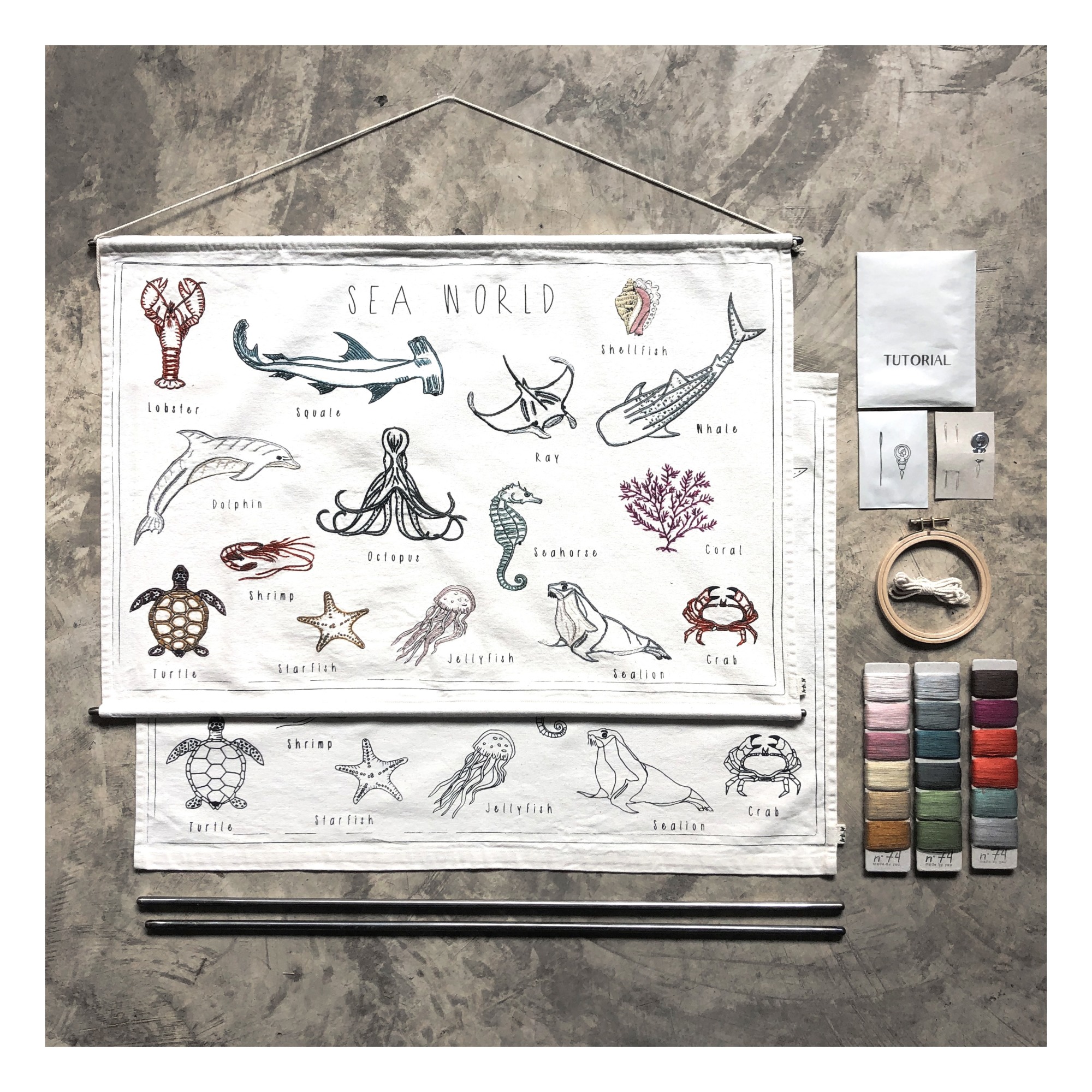 Mobile Jellyfish – Cocon // Poster à broder Sea Word – Numero 74 // Coquillage crochet – Laetitia Dalbies // Coussin coquillage – A la maison & co // Doudou Crabe – BigStuffed // Collier crevette – Laurene Vernet // Torchon sérigraphié crabe – La cerise sur le gâteau