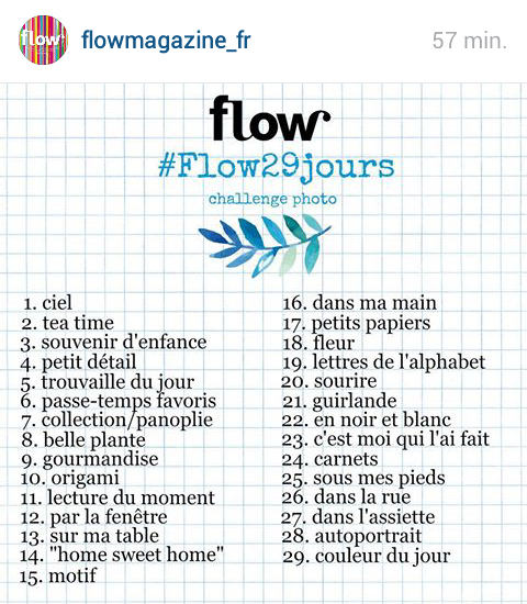 Le magazine Flow organise un challenge photo sur le média social Instagram. Tout au long du mois de Février, chaque participant(e) doit relever le défi en postant chaque jour une photo selon un thème donné. Le challenge se finit lundi prochain, avec au compteur 29 photos postées sur mon compte IG…du moins si j’avais été assidue. Un bon moyen de se motiver à poster régulièrement sur la plateforme. Un moment de partage et de découverte avec les autres participants et utilisateurs du réseau social.