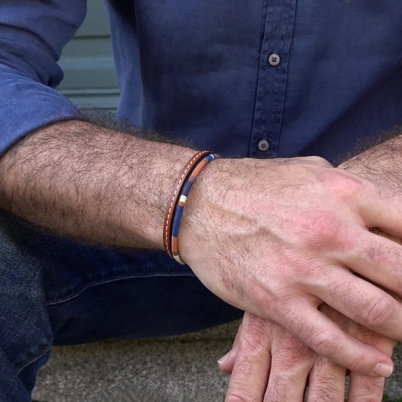 – Bracelet cuir et cordon de lin tissé bleu – AraigneeGypsie